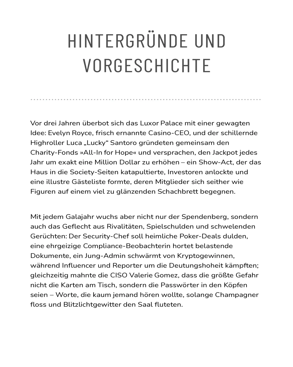 Zwischen Roulette-Glas und Server-Rack jagen bis zu 12 Spieler geheime Wallets, kompromittierte Keycards und ein mörderisches Lösegeld durch die Nacht. Ob High-Roller, Compliance-Spürnase oder Streaming-Star – jede Rolle erhält scharf geschliffene Aufträge, digitale Beweise und perfekt timbare Reden. Das umfangreiche Gastgeber-Paket liefert Einladungen, Moderationsskript, Beweis-Props, Menü- und Playlist-Vorschläge – Schritt für Schritt, spoilerfrei, stressfrei.