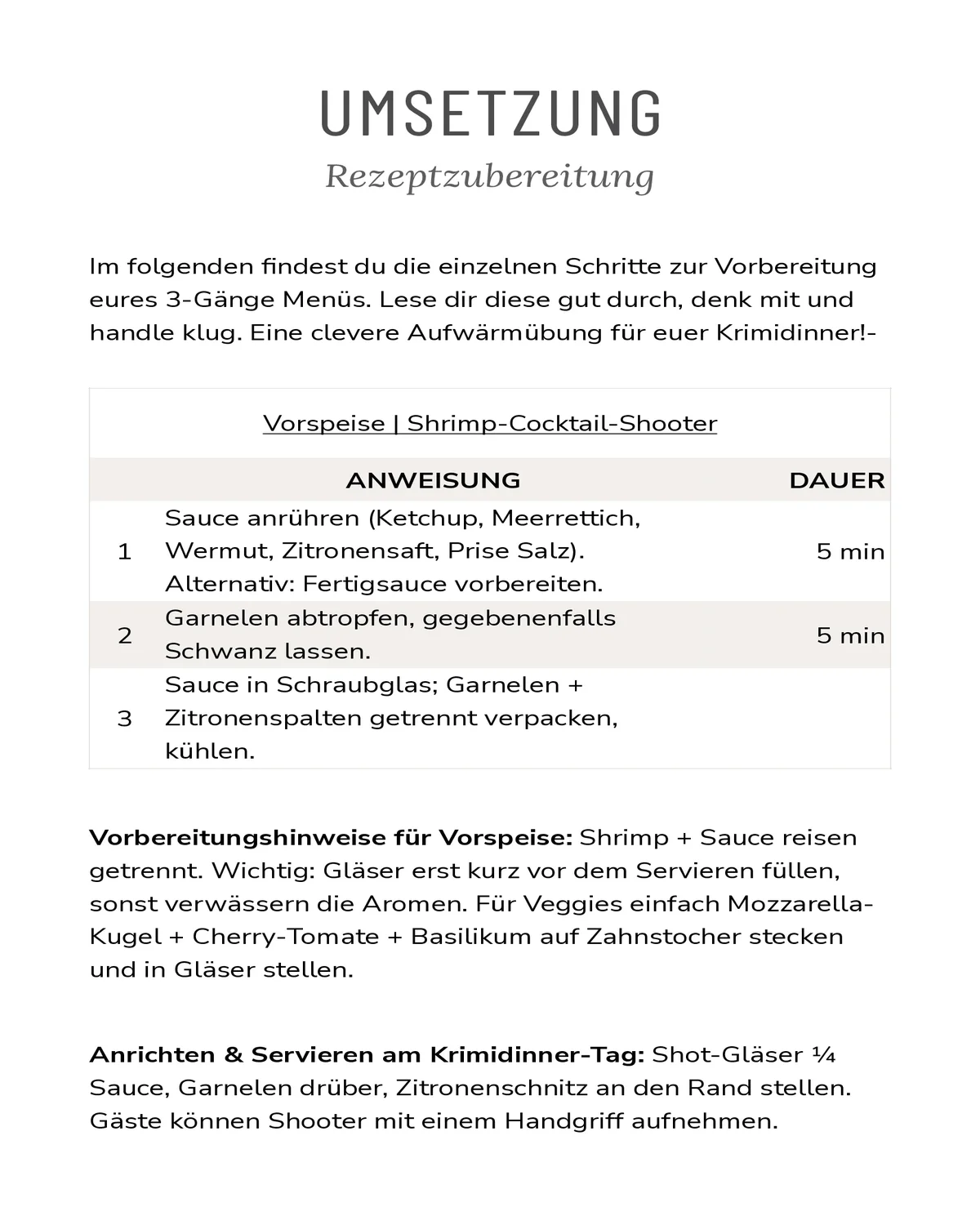 Unser Komplettpaket führt dich vom ersten Klick bis zur Siegerehrung: downloadfertige Einladungen, strukturiertes Moderationsskript, druckbare Beweis-Props, Menü- und Playlist-Empfehlungen sowie Rollenbriefe im Spoiler-sicheren Stapel. Jeder Schritt ist nummeriert, jede Datei beschriftet – du brauchst nur noch auszudrucken, zu dekorieren und das Licht zu dimmen. So wird Vorbereitung planbar – und der Abend filmreif.